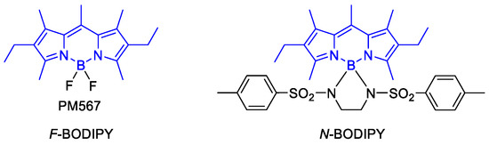 In this context, we have recently reported the straightforward preparation of N-BODIPYs, i.e., BODIPYs having N-groups at boron (Figure 1) [19]. While keeping the photophysical properties of parent F-BODIPYs (i.e., BODIPYs having fluorine atoms at boron, see Figure 1), N-BODIPYs have the advantage, over other related at-boron-functionalized BODIPYs, such as O-BODIPYs, that up to four different moieties can be placed near the BODIPY chromophore, due to the bonding features of the nitrogen atom in comparison with oxygen. Thus, the N-BODIPY design is an attractive scaffold to engineer smart BODIPYs with multiple functions, which is especially interesting when developing BODIPYs for biophotonics.