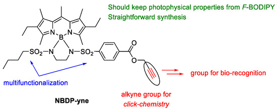 Following our initial hypothesis, we designed N-BODIPY NBPD-yne (Figure 2) as a key intermediate to BODIPY dyes for cell-imaging, based on the following premises: (1) functionalization at boron to keep the excellent photophysical signature of parent F-BODIPY, (2) straightforward synthesis from commercially available F-BODIPY, (3) possibility of multifunctionalization through the N-groups, and (4) alkynyl group for the easy post-derivatization (by click chemistry) for bio-recognition.