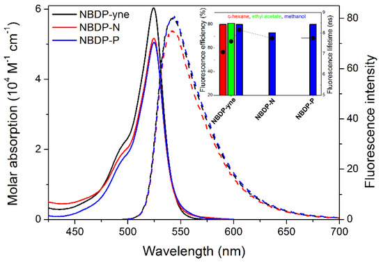 Absorption (bold lines, scaled by the molar absorption coefficients) and fluorescence (dashed, scaled by the fluorescence quantum yield) spectra of the three designed N-BODIPYs (NBDP-yne, -N, and -P) in diluted solutions in methanol (micromolar). Inset: corresponding fluorescence quantum yield and lifetime data.