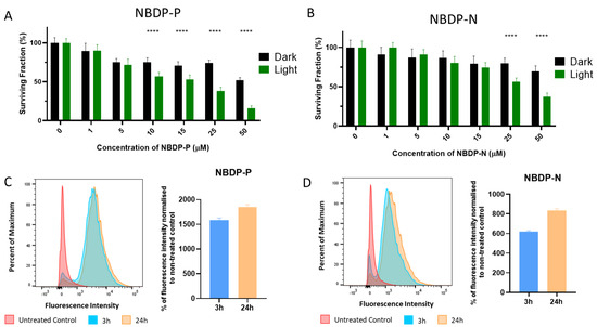 Biological assessment in pancreatic ductal adenocarcinoma (PANC-1) cells. (A,B) Cell viability after photodynamic therapy (PDT) treatments with NBDP-P (A) or NBDP-N (B). Green bars show viability 48 h after illumination and black bars represent dark toxicity (non-illuminated group). Statistically significant differences are labeled as **** p < 0.0001 for comparisons between dark and photo-toxicity. (C,D) Internalization studies in cells incubated with NBDP-P (C) or NBDP-N (D). Histograms represent 20,000 cells analyzed per condition: untreated controls (red), 3 h incubation with the N-BODIPYs (blue) or 24 h incubation (orange). Fluorescence intensity was analyzed at 0 h post-incubation. Bar charts show median fluorescence intensity of the aforementioned incubation times normalized to untreated controls.