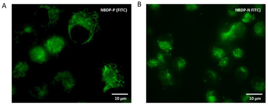 Live cell imaging of PANC-1 cells incubated with 5 µM of (A) NBDP-P or (B) NBDP-N for 3 h. The fluorescence pattern suggests a mitochondrial subcellular localization. Scale bar = 10 µm.