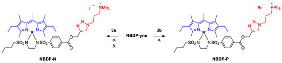 Once we had intermediate NBDP-yne in hand, we proceeded to its chemical derivatization. As a proof of concept, we chose to introduce ammonium and phosphonium moieties as groups that had been described before for the labelling of mitochondria [21,22,23,24]. These groups where easily introduced by standard click chemistry (CuSO4, sodium ascorbate) in NBDP-yne, using the corresponding azide-functionalized reagent (see Scheme 2).