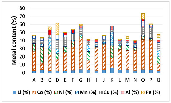 Broad type of BM samples (A to Q) were characterized (elemental composition in Figure 1). The composition values show significantly wide metal content ranges for each metal (for example Mn 1–17%, Ni 1–21%, and Co 8–38%). This is a reflection of the different chemistries of the collected batteries involved in the production of each BM.