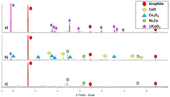 The LiCoO2 structure (present in the cathodic active material in working batteries) is transformed, after being heated over 200 °C [2,3], into an oxide mixture containing Co(II) and Co(III). If the thermal treatment is carried out above 500 °C in reducing conditions, part of the cobalt and other metals present in the BM can be reduced to metallic state [4,5]. This was proven after performing SEM-EDS analysis of thermally treated BM samples, where part of the active cathodic oxides started to transform in metallic particles, as seen in Figure 3 for sample L. EDS mapping was performed, showing their metallic alloy nature (while grey ones had different Co:O ratios), and that bright areas were free of oxygen.