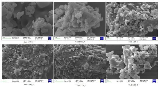 It was no need for sputter-coating of the samples for SEM observation, as yeelimite proved to be enough conductive. In Figure 1, it is observed that the crystals of the samples form a variety of sizes and many aggregates. Yeelimite of 5 h cured samples forms more and bigger aggregates than the 3 h cured samples. Yeel.1300_3 varies in size from approximately 1 μm to about 2 μm, while most of the grains of Yeel.1330_3 are less than 1 μm. So, Yeel.1330_3 consists of about 30–35 nm of nanocrystals. This result can be attributed to the fact that yeelimite is more stable at temperatures lower than 1330 °C, as yeelimite is unstable over 1350 °C [2]. Moreover, according to the Mineralogical Society of America, crystals of yeelimite at cement are 15 nm in aggregates [7], so according to the results of the present study, stoichiometric yeelimite samples formed bigger crystals. In addition, crystals of Yeel.1300_3 and Yeel.1330_3 exhibit a polygonal shape, similar to that of yeelimite in CSA cement [11], while yeelimite in all other samples is more rounded.