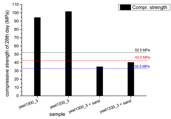 Compressive strength of Yeel.1330_3 and Yeel.1300_3 specimens with and without standard sand at the 28th day of hydration. The 3 lines correspond to values of the 28th day of EN 197-1:2000 classification of cement.