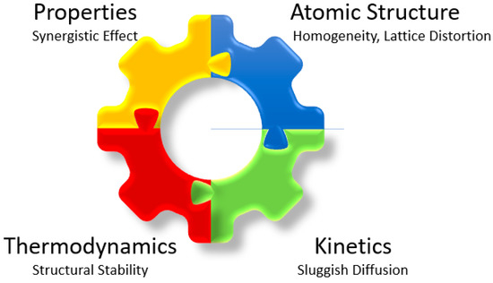 It is clear that there is a vast field of possible combinations of elements that can be utilized for synthesizing CCAs. Thus, some selection criteria have been stipulated for elements, which can be used for producing CCAs with certain properties [25]. There was the early hypothesis that phase evolution and stability and the exceptional properties in HEAs and CCAs are attributed to the four core effects [26]. In order to design new alloys, it is necessary to keep under consideration the four core effects describing these alloys, since using different alloying elements expands the field of diversity, and we can obtain various properties [13,27].