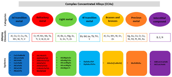 Illustration of the studied CCAs categories sorted by elemental groupings as Senkov et al. defined in their work [13].