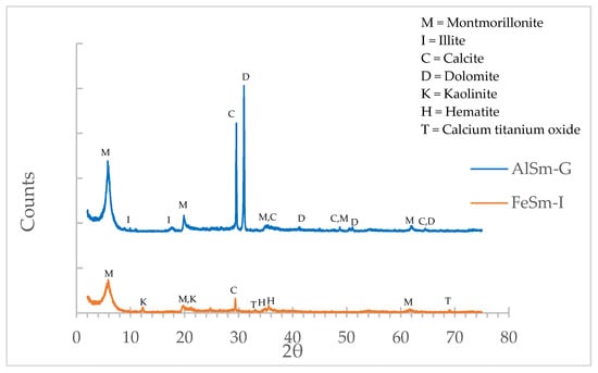 The XRD spectra and the mineralogical compositions of the two raw materials are presented in Figure 1. The peaks of AlSm-G smectite are assigned to montmorillonite, calcite, dolomite, and illite, while the FeSm-I smectite contains montmorillonite, kaolinite, hematite, calcite, and calcium titanium oxide.