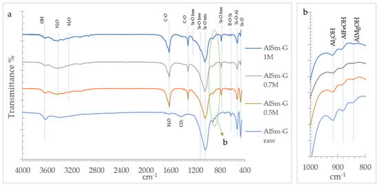 (a) FTIR spectra of AlSm-G smectite (raw and activated with 0.5, 0.7, and 1 M oxalic acid); (b) FTIR spectra (Section 1000–800 cm−1) of raw and treated AlSm-G smectites.