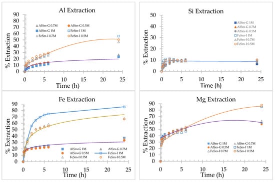 Extraction of metals versus time for AlSm-G and FeSm-I smectites in oxalic acid (80 °C; acid concentrations of 0.5 M, 0.7 M, and 1 M; 2% of pulp density).