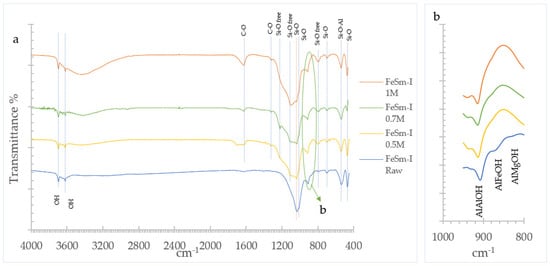 In the FTIR spectra of the FeSm-I raw smectite and activated samples (Figure 4a), the bands at 1030 cm−1 and 1012 cm−1 are assigned to Si-O stretching band []. There are also the two bands for calcium oxalate at 1627 cm−1 and 1318 cm−1. The bands at 3623 cm−1 and 3696 cm−1 are assigned to hydroxyl groups joined together with octahedral atoms. The intensity of the latter bands reduces with acid treatment, due to the removal of the hydroxyl groups connected to the octahedral atoms that are leached out from the smectite structure []. The peaks of Al2OH, AlFeOH, and AlMgOH gradually decrease as the acid concentration increases, which is confirmed by the metals’ extraction diagrams (Figure 3).