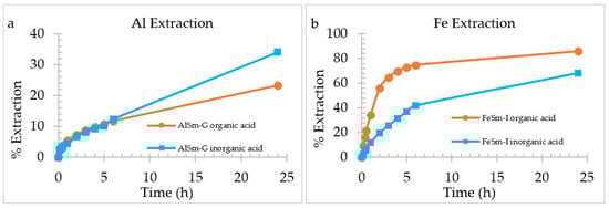 (a) Extraction of aluminium versus time for AlSm-G smectite and (b) extraction of iron versus time for FeSm-I smectite, in oxalic and sulphuric acid (80 °C; acid concentration 1 M; 2% pulp density).