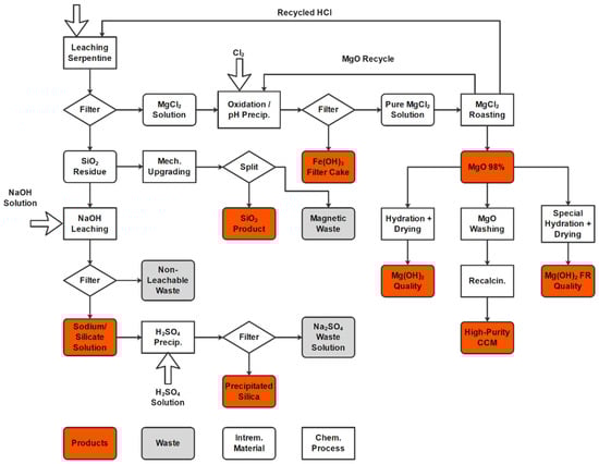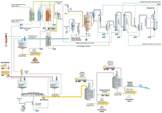 A commercial application of the conceptual carbon-neutral process is shown in the process flow diagram (PFD) in Figure 2. The process comprises unit operations currently offered by KON Chemical Solutions and Tenova and incorporates public-domain knowledge gained from decades of process development [1,2,3,4]. It includes the commercially established unit operation for producing high-quality synthetic magnesium oxide (MgO). If the process includes a carbon-neutral heating system, it will constitute the first industrial-scale carbon-neutral process for the production of MgO. There is also the potential for the minimization of waste by commercializing by-products such as silica [5]. The process for this is described below.