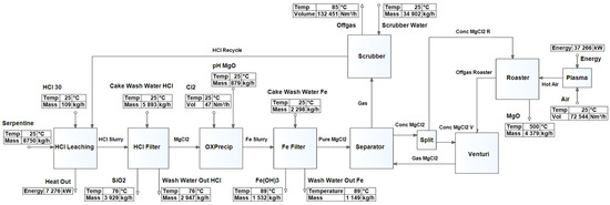 A mass and energy balance model of the process from raw material leaching to MgO roasting was built using the Outotec HSC software. The output from the model is summarized in Figure 3.