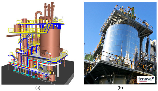 The Tenova MgO roaster, with a capacity of 3000 L/h of MgCl2 solution: (a) 3D model developed during the design phase; (b) the completed unit in operation.