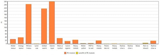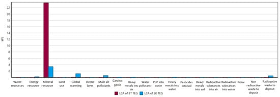 The results obtained for both the BT and SK modules are represented in Figure 3. The extremely high impact on the mineral resources category for the BT module is caused by the presence of bismuth, antimony, tellurium, and selenium in large quantities in the production steps. All the mentioned raw materials are included in the EU’s list of Critical Raw Materials [5]. In particular, the legs dicing step implies a huge waste of the BT material, much higher than the SK waste, as assumed in Iyer, R.K. et al. [19]. Different production processes might reduce such a massive impact on resources depletion. Aquatic ecotoxicity and human toxicity are the categories that, after the abiotic depletion one, present the major relevance for the BT module according to the CML-IA baseline method. Although wastage of the TE material is lower for the SK module production, the impact on mineral resources is serious. Even in this case, critical raw materials are used, such as antimony and cobalt. Moreover, p- and n-type legs both contain rare earths like didymium (obtained from praseodymium and neodymium), lanthanum, and ytterbium. Alumina plates and p-type legs production processes affect global warming and air pollutants and PM categories the most, more than the BT module, despite the smaller amount of material required for production. Another significative result is related to the radioactive waste, which mainly depends on the amount of electrical energy needed for the production processes. In the modelling phase, an averaged input parameter was selected for the electricity production and consumption, which refers to the European statistics and, thus, it includes electricity production from nuclear plants.