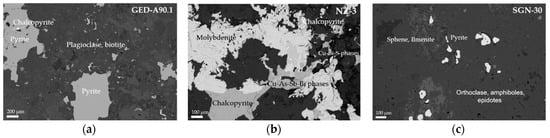 Sample SGN-30 (Figure 2c) represents a diorite of the propylitic alteration zone. It is a light-gray, whitish rock with a coarse granular texture. The sample is composed of silicates (orthoclase, amphiboles and epidote). Minor calcite occurs. Accessory minerals are apatite (Ca-phosphate), zircon (ZrSiO4), sphene (CaTiSiO5), and ilmenite (FeTiO3). The mineralization comprises disseminated pyrite, including MoS2, PbS and Te-Bi. Rare sphalerite (ZnS) is observed.