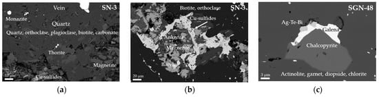 SEM micrographs: (a) SN-3: Matrix feldspars with thorite inclusions; (b) SN-3: Chalcopyrite around ankerite and magnetite grains; (c) SGN-48: Cu-sulfide mineralization with galena and Ag-Te-Bi particles.
