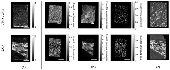 Results for samples GED-A90.1 (top) and NZ-3 (bottom): (a) Medium-Z concentration computed from DE-XRT measurement; (b) Areal density computed from ME-XRT measurement for low-, medium- and high-Z elements (from left to right); (c) Virtual cross section through reconstructed CT data. Scale bars are 10 mm.