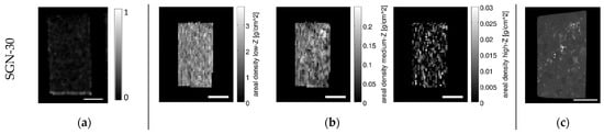 Results for sample SGN-30: (a) Medium-Z concentration computed from DE-XRT measurement; (b) Areal density computed from ME-XRT measurement for low-, medium- and high-Z elements (from left to right); (c) Virtual cross section through reconstructed CT data. Scale bars are 10 mm.