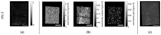 Results for sample SN-3: (a) Medium-Z concentration computed from DE-XRT measurement; (b) Areal density computed from ME-XRT measurement for low-, medium- and high-Z elements (from left to right); (c) Virtual cross section through reconstructed CT data. Scale bars are 10 mm.
