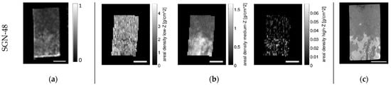 Results for sample SGN-48: (a) Medium-Z concentration computed from DE-XRT measurement; (b) Areal density computed from ME-XRT measurement for low-, medium- and high-Z elements (from left to right); (c) Virtual cross section through reconstructed CT data. Scale bars are 10 mm.