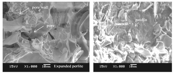 SEM images of expanded perlite (left) and paraffin-expanded perlite (right) [17].