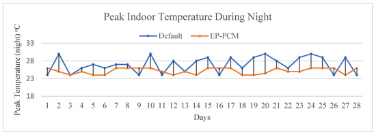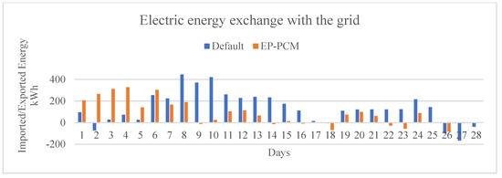 The nZEB Living Lab is supported by a PV field and six wind turbines and it is also connected to the grid. Therefore, the set-up prioritises the RES generated power to be provided to the building, and if there is no available power, then the building is supported by the grid. In Figure 4, the energy above the X-axis represents the imported energy from the grid (consumption > production) and the energy below X-axis represents the exported energy (consumption < production). It is observed that in the first case, the building consumption is directly related to the environmental conditions, leading to increased consumption in days with less RES energy production (i.e., Day 8–10) and reduced consumption during days with higher RES energy production (i.e., Day 26–28). On the contrary, the second case utilises a strategy to charge the EP-PCM walls in the beginning of the scenario (i.e., Day 1–4) and then exploits this thermal energy in order to reduce the electric energy imported from the grid. Hence, the average energy imported during the EP-PCM case is considerably reduced compared to the default case.