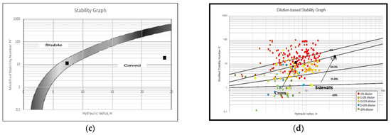In Figure 1, the “Yielded Elements” distribution (Figure 1a), the ore dilution rates (Figure 1b), and the results of the analysis through the examined empirical stability graphs (Figure 1c,d) are shown for a selected case study (#12).