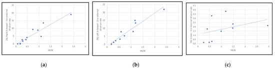 (%) ore external dilution rate—HR/N’ diagrams: (a) right sidewall (HW); (b) left sidewall (FW); (c) crown.