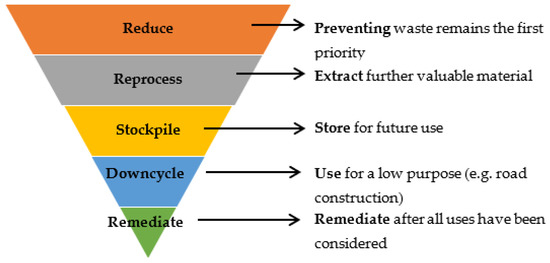 The European and Polish waste policy is based on the applicable waste hierarchy: the waste framework directive—the Polish Act on Waste [8]. Lèbre and Corder (2015) adapted the waste management hierarchy to mining (Figure 1) [9].