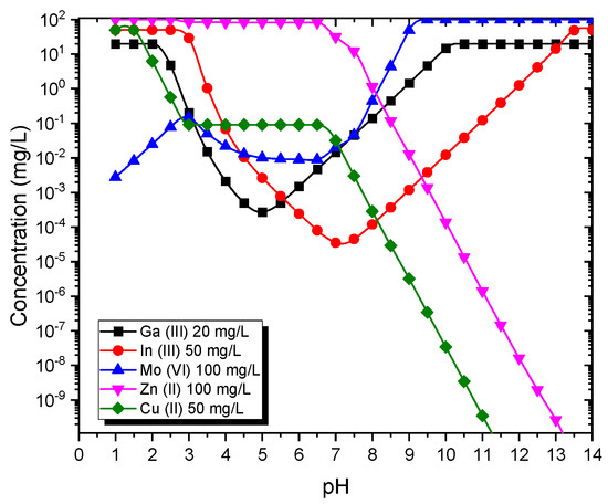 Solubility of Ga, In, Mo, Zn and Cu vs. pH obtained by Visual Minteq.