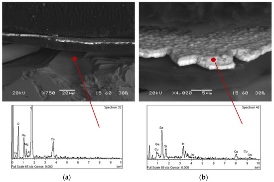 The microstructural and morphological characteristics of the thin film PV panels were investigated by scanning electron microscopy in polished sections (Figure 2). The identified layers were the outer glass layer, the EVA membrane, the ZnO layer, the thin film semiconductor (CIGS layer), the Mo back contact/backsheet and the glass substrate.