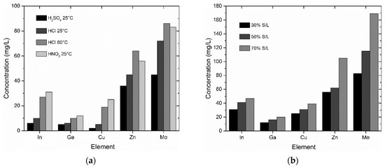 Figure 3a shows the leaching results for the thin film-coated glass fragments with a S/L ratio of 30% for the different leaching media tested. Higher concentrations were obtained for all metals when HNO3 (25 °C) and HCl (80 °C) were used. Moreover, leaching with HNO3 led to faster delamination of the thin film (30 min vs. 4 days in the case of HCl), so HNO3 was selected for further leaching experiments.