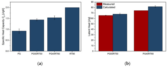 (a) Average specific heat capacity of PG, CPCMs and RT90 in the temperature range of 25–100 °C after 96 cycles. (b) Measured and calculated latent heat of CPCMs.