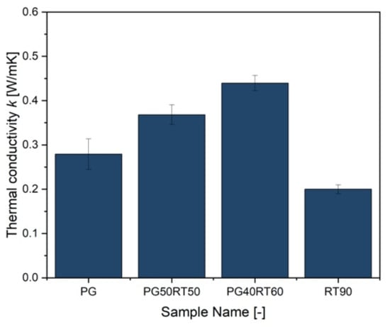 - PG40RT60 samples demonstrate the highest thermal conductivity, 0.46 W/mK on average in the examined temperature range.