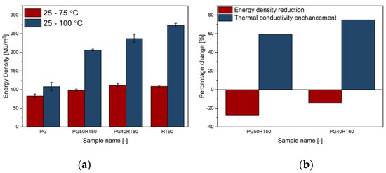 In the 25–75 °C range, PG demonstrates the lowest energy density and PG50RT90 the highest (Figure 3). This is anticipated as the heat storage capacity of pure PG is substantially lower than the RT90 and thus also the CPCMs. However, at this temperature range, the energy density is in the form of sensible heat. It is thus dependent, aside from the specific heat capacity, on the density of the material. Therefore, the low density of the paraffin counterplays its high specific heat capacity resulting in a low energy density, closer in magnitude to pure PG. At 25 to 100 °C, where the latent heat is taken into account, the paraffin outshines in performance.