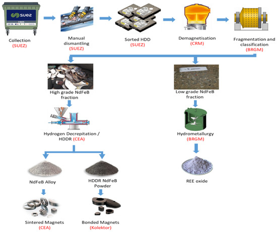 - Menad, N.; Seron, A.; Save, M.; Menard, Y.; Maat, N.; Le Breton, J.-M.; Nachbaur, V.; Bizouard, A.; Delain, M.; Waignein, L. Recovery of permanent magnets type NdFeB from WEEE. In Proceedings of the 6th International Conference on Engineering for Waste and Biomass Valorisation, Albi, France, 23–26 May 2016. [Google Scholar]