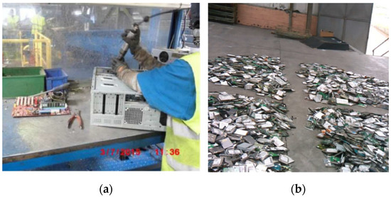 (a) Manual disassembly of the personal desk computers. (b) HDDs sorted for sampling.
