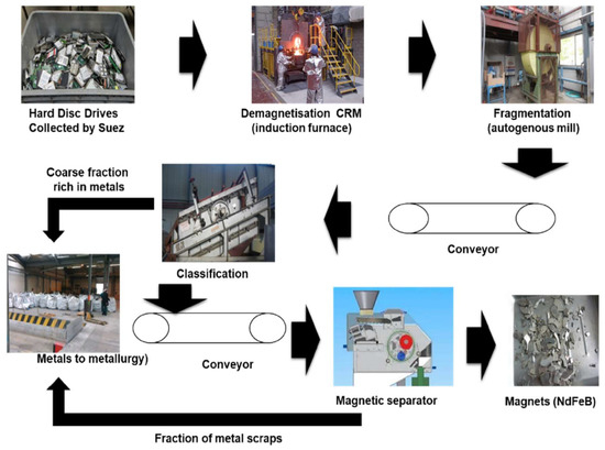 From the recycling process technology, three available options have been applied to the recycling of NdFeB magnets: (1) direct reuse, (2) recycling of the permanent magnet alloy, and (3) elemental recycling, which means the extraction of REEs or oxides [6]. From an environmental and economic point of view, the most favourable is direct reuse, followed by alloy and elemental recycling. However, the magnets’ characteristics, such as shape, dimensions, chemical compositions, magnetic properties, and required specifications, render the first option (reuse) often not feasible. On the other hand, keeping and recycling the magnetic alloy as a whole appears to be very attractive in terms of energy, environmental, and raw materials costs. At the same time, the elemental recycling from the more complex hydrometallurgy process can be used for a low-grade feed [7,8].