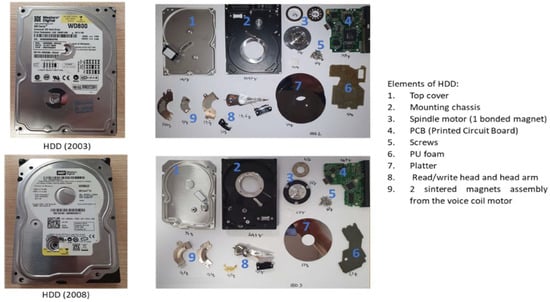 The waste electrical and electronic equipment (WEEE) was sorted by the SUEZ WEEE dismantling plant in France via manual disassembly of desktop personal computers (PCs), allowing the extraction of the HDDs (see Figure 2). The input fraction corresponds to old appliances collected in the B2B WEEE scheme produced by businesses (90% is currently collected). Therefore, this fraction is mainly composed of desktop computers. Two examples of 3.5-inch HDDs have been characterised by manual disassembly; they correspond to Western Digital brands.