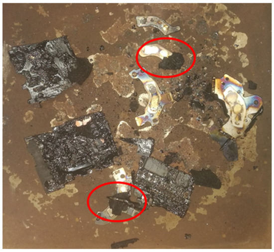 Example of components observed after thermal treatment at 305 °C during 90 min. With the red circles representing the burnt organic parts over metallic elements.