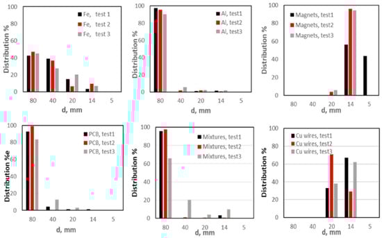 The materials that were manually sorted by particle size classes (80, 40, 20, 14, and 5 mm) obtained from the classification of fragmented HDDs for the three pilot tests were weighed. The percentage distributions were calculated, and the results are illustrated in Figure 6. This figure shows that most iron scraps were present in both the 80- and 40-mm size fractions for the three pilot tests. Pieces of aluminium and PCB were found in the coarse fraction. This confirms that the autogenous mill did not shred these parts, which is good for a further recovery process. Almost all the magnets were present in the fine fractions because, after heating, the magnets became brittle and easy to break. Copper wires were found in the 20- and 14-mm size fractions. Some parts that were not released were present in the coarse fraction; they need to be shredded for further processing.