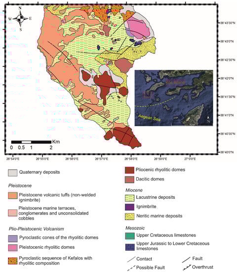 - Triantaphyllis, M. Geological map of Greece, Western Kos (Kefalos) Sheet, 1:50000; I.G.M.E.: Athens, Greece, 1994. [Google Scholar]