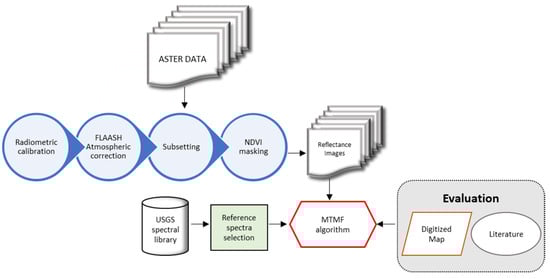 The pre-processing steps followed are ssummarised in Figure 2 and include georeferencing, radiometric calibration and atmospheric correction. The ASTER image was georeferenced in the Greek Geodetic Reference System (EGSA87). From the ASTER spectral data set, the 3N and TIR bands were excluded, and then, by applying layer stacking, the VNIR and SWIR bands were merged into one dataset so that all bands obtained the same spatial resolution (15 m). Furthermore, the ASTER image was spatially subsetted to facilitate the workflow and reduce the technical requirements of the analysis. The satellite data were radiometrically calibrated, converting DN values to radiance. Finally, the atmospheric correction was achieved using the Fast-Line-of-sight Atmospheric Analysis of the Spectral Hypercubes (FLAASH) module [36] to eliminate atmospheric effects of water vapour and aerosols and rescale raw radiance to reflectance values.