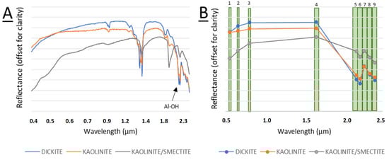 The spectral characteristics of the selected minerals are illustrated in Figure 3. Since smectite and illite are only present in minor quantities [21], kaolinite, dickite and kaolinite/smectite spectra were used as a reference.
