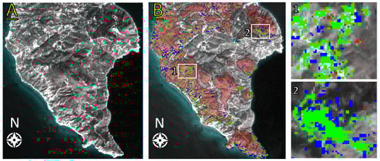 (A) Radiometrically calibrated and atmospherically corrected ASTER image of Kefalos peninsula; (B) Spatial distribution of kaolinite (green), dickite (red) and kaolinite/smectite (blue) derived from MTMF algorithm related with volcanic rocks (in red areas). Areas in numbered white boxes are displayed on the right, on a magnified scale, representing the small occurrence of dickite and kaolinite/smectite compared to kaolinite in west Kefalos (1) and the perlite quarry (2).