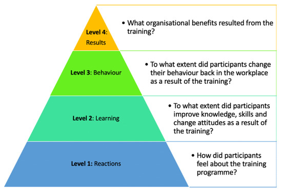 One of the most acknowledged and widely used evaluation methodologies is Kirkpatrick’s four-level training evaluation model [29]. The Kirkpatrick model uses a comprehensive four-level strategy to evaluate the effectiveness of any training course or program (Figure 2):