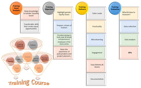During the design phase, the specific objectives of the training program for the labor of women in the stone sector were defined as follows: to highlight gender equity issues, to prepare trainers capable of delivering the participatory and gender-based approach in the stone sector, to educate adults with an emphasis on women, to develop specific skills, such as the ICT skills or the soft skills of communication and networking, and lastly, to develop marketing strategies and raise the awareness of policymakers. The goals of the training project are in line with the goals of the WinSTONE project, i.e., expand on existing educational offerings, increase peer-networking opportunities, develop a system of support and mentorship with other women in the industry, create opportunities for women to serve on key industry jobs, recognize emerging and experienced women who excel in the industry, etc. A clear definition of the objectives is crucial since it provides a clear picture of what the training program is trying to reach, and it serves as a baseline that will be used to measure the results of the educational program after its end.